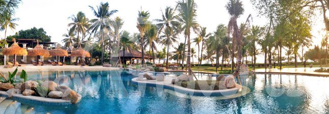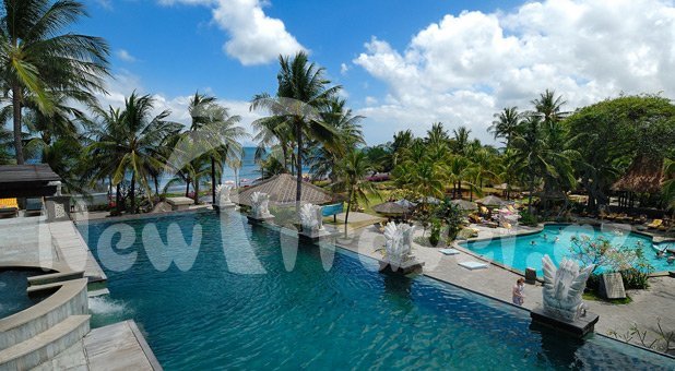 Bali. Hotel Bali Mandira Beach Resort & Spa se nachází v jižní části ostrova, v letovisku Legian - Kuta, v tomto živém letovisku najdete restaurace, obchůdky, bary vše co nabízí rušná místa Asie.