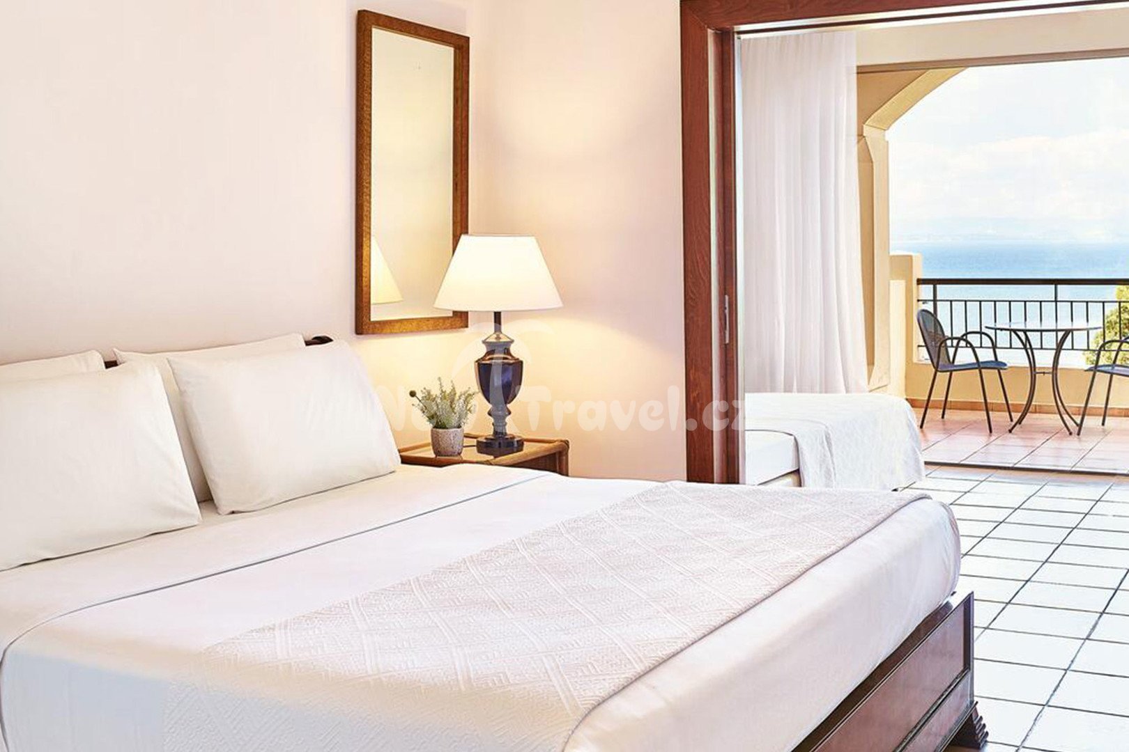 - Dvoulůžkový pokoj hotelu Grecotel Olympia Oasis s bočním výhledem na moře má cca 30 m² a je vybaven manželskou postelí nebo dvěma samostatnými lůžky, třetím samostatným lůžkem, je umístěn v přízemí nebo prvním patře hlavní budovy, má koupelnu se sprchou nebo vanou, WC, fénem, pantoflemi, TV/sat., klimatizaci, WiFi (zdarma), set na přípravu kávy/čaje, balkon nebo terasu.Tento typ pokoje lze také rezervovat s výhledem na moře.