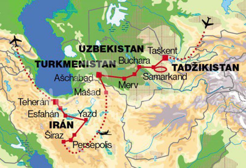 Poznávací zájezdy Uzbekistán. Trasa poznávacího zájezdu Hedvábnou cestou do Persie: Uzbekistán, Turkmenistán, Írán; zrcadlo světa, šperk vesmíru, putování s touhou v srdci; jeden z nejkrásnějších a nejvíce obohacujících přechodů světa; vysoká úroveň služeb, dobrodružné poznání; úžasná propracovaná cesta