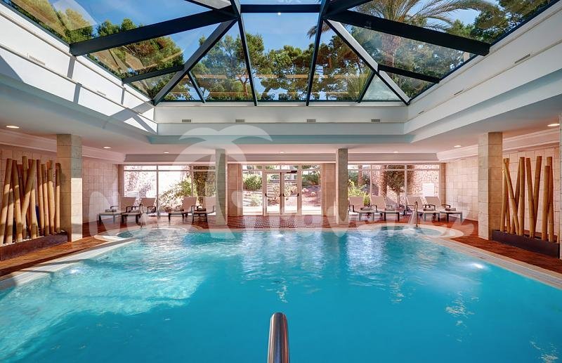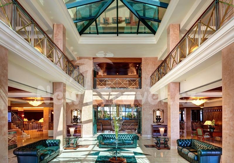 Recepce hotel Hipotels Hipocampo Palace & Spa se vstupní halou, 2 restaurace, bary, výtah, klimatizované společenské prostory, místnost s TV, internetové připojení, pokojový servis, parking, bazén s lehátky a slunečníky, dětský bazén, dětský park, bezbariérový přístup, jacuzzi, fitenss centrum, úschovna zavazadel, wifi, půjčování aut, kol, wellness centrum, krytý bazén, sauna, stolní tenis, tenisové kurty, Business centrum