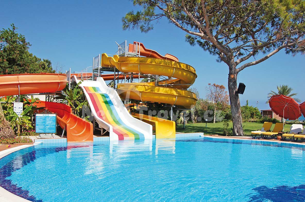Dále pěkný venkovní bazén, bazén se skluzavkou a tobogánem a bazén pro děti (lehátka, matrace a slunečníky zdarma).