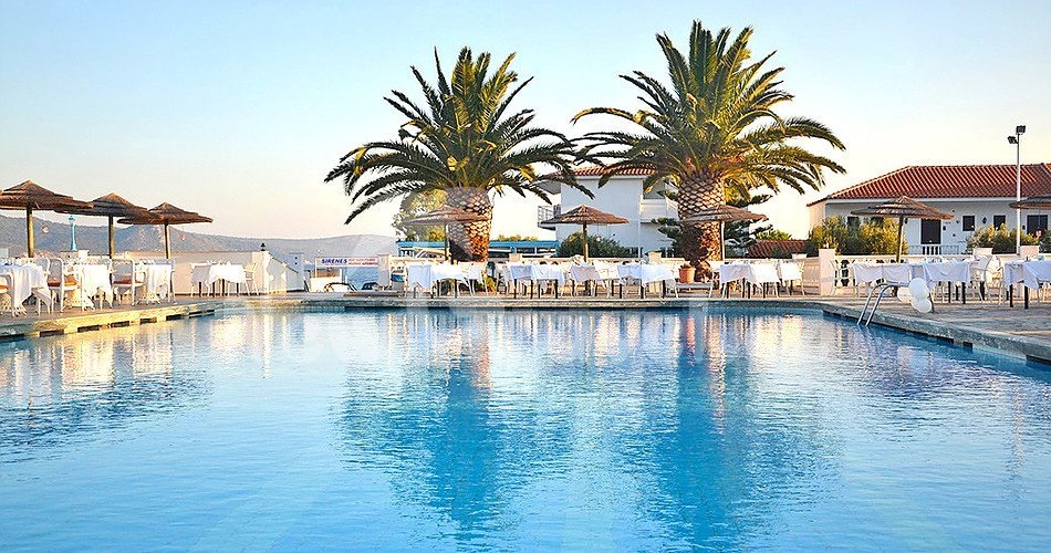 Řecko - Samos - Pythagorion. Přátelský hotel Sirenes Beach Resort leží jen pár kroků od krásné oblázkové pláže a poskytuje maximální komfort, který na své dovolené očekáváte. Typická řecká pohoda vás uchvátí na první pohled. Během dne jsou připraveny animační programy, večer oceníte posezení v hotelovém baru.