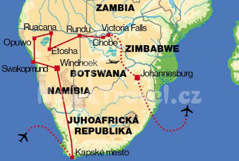 Poznávací zájezd Zimbabwe. Trasa zájezdu: Jihoafrická republika, Namibie, Botswana, Zimbabwe, Zambie - Nejvíc praktických zkušeností v ČR, jsme tu od roku 1989; největší písečné duny na světě, kaňon na Rybí řece; kraj pouště Kalahari, meteorit, rozlehlé pláně Etoshy, Chobe a Zambezi; komfortní hotely a bungalovy se snídaní;
