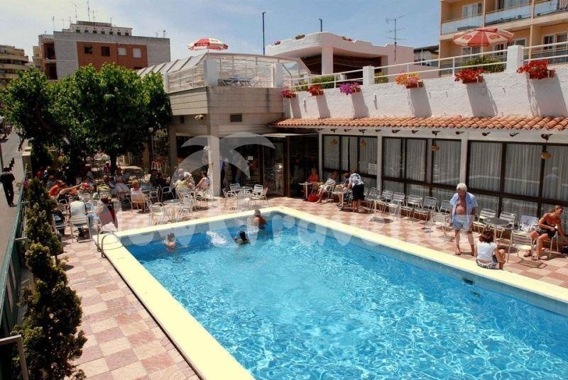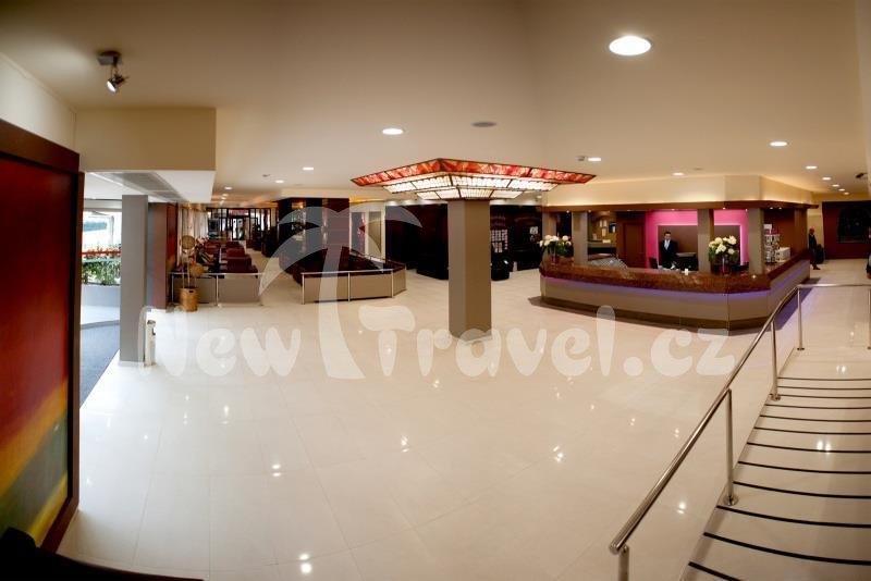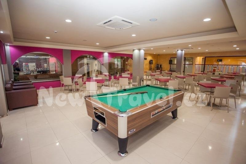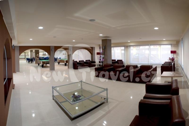 recepce hotelu MARIA DEL MAR, výtah, TV místnost, salonek, restaurace, bar v hotelu, bar a kavárna u bazénu, bazén, dětský bazén, krytý bazén, animační programy. Od centra: 20 m. Od pláže: 300 m.