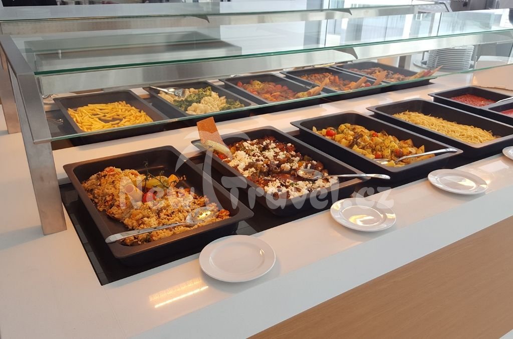 - Hlavní restaurace: 7.00–10.00 snídaně formou bufetu, 10.00–10.15 pozdní kontinentální snídaně (omezený výběr pokrmů), 12.30–14.30 oběd formou bufetu, show cooking, 19.00–21.30 večeře formou bufetu, součástí večeří show cooking, tematické večeře (například řecká, italská, mexická). U snídaně nealkoholické nápoje, káva a čaj, u oběda a večeře nealkoholické nápoje, pivo, víno (vše místní výroby, rozlévané)