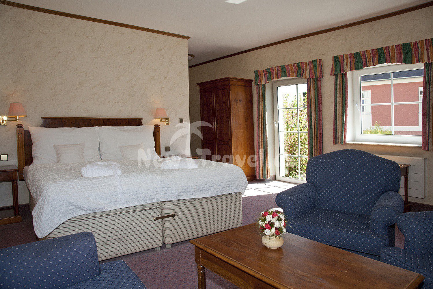 nekuřácké, příjemně zařízené stylovým nábytkem, s koupelnouz mramoru s vanou nebo sprchou, WC, fénem, županem, sat. TV a telefonem. Jednolůžkové pokoje: dvoulůžkový pokoj obsazený jednouosobou. Dvoulůžkový pokoj.