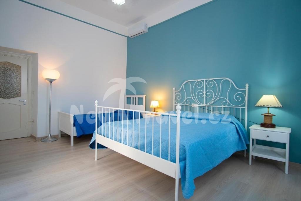 Apartmány v patře o rozloze 70 metrů čtverečních. Je složený z ložnice s manželským lůžkem a samostatným lůžkem, druhým pokojem se dvěma samostatnými lůžky, obývací místnost s plně vybaveným kuchyňským koutem, sociální zařízení, prostorná terasa 27 metrů čtverečných s výhledem na moře, TV, klimatizace ve všech místnostech, pračka, WiFi, fén, žehlička a žehlící prkno.