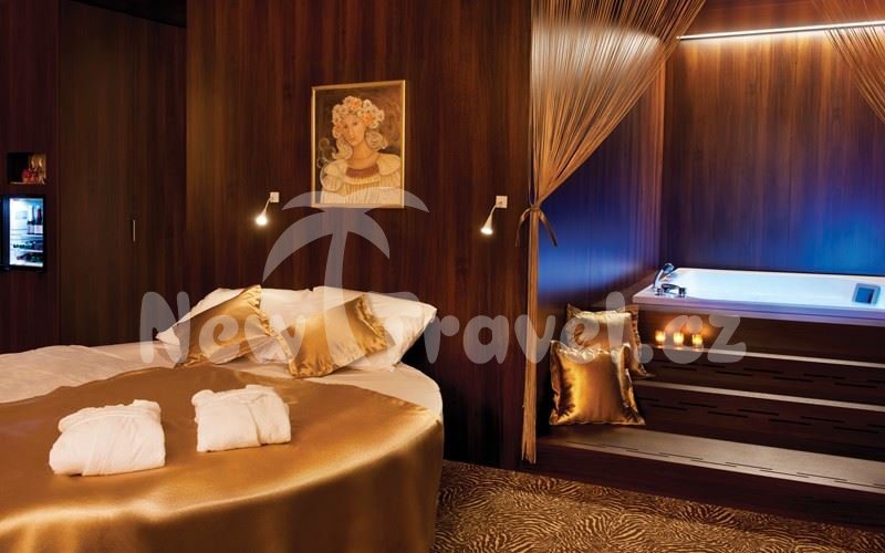 je v luxusně vybavených pokojích a Suite. Všechny jsou vybaveny koupelnou (sprcha nebo vana), WC, LCD TV, telefonem, minibarem, sejfem, klimatizací, připojením na internet. 8 Suite které vám nabízíme, jsou navíc vybaveny saunou (část Suite) a whirpoolem a kruhovými lůžky.
